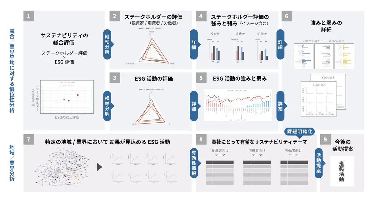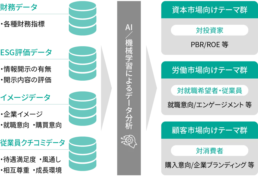 電通沖縄は、このギャップを埋めるために、dentsu Japanが提供する「非財務価値サーベイ」を導入。財務データ、ESG評価、企業イメージ、従業員クチコミなどのビッグデータを統合的に分析し、企業の非財務活動がどのステークホルダーに響いているか、競合と比べてどこに強みがあるか、今後注力すべきテーマは何かを明らかにします。