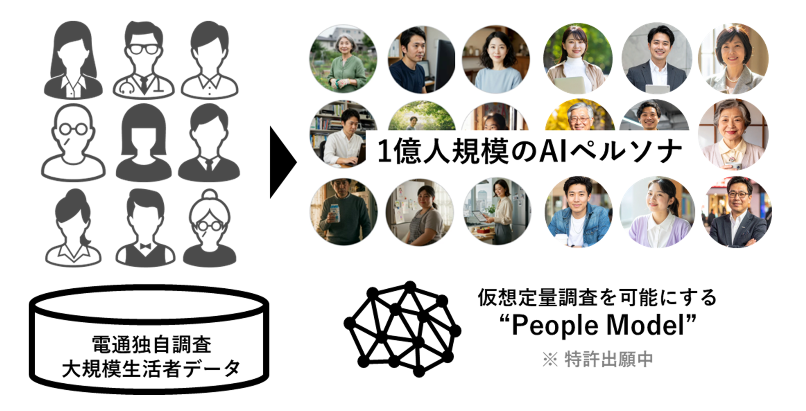 電通が保有する大規模調査データをもとに、1億人規模の高解像度なペルソナを仮想再現するAIモデルです。これにより、従来の限定的なターゲット分析を超え、時間やコストの制約を受けずに、仮想アンケートやマーケットシミュレーションが可能になります。沖縄のようにサンプル確保が難しい地域でも、精度の高い仮説検証が実現します。